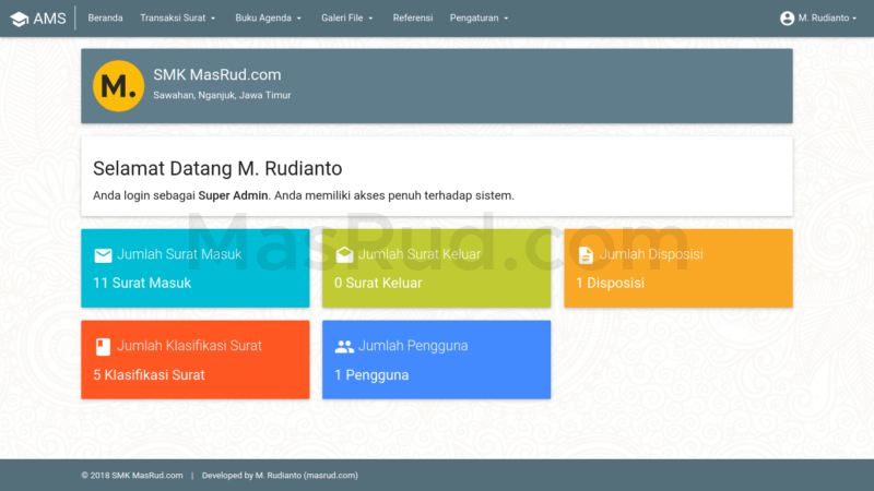 Buka browser dan akses http://localhost/ams/. Jika instalasi berhasil, halaman login akan muncul. Login menggunakan username masrud dan password masrud.com.
